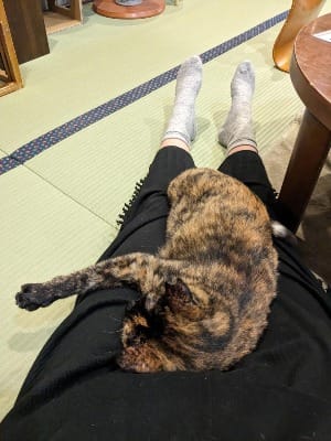 Right before I left, a young man came in, clearly not familiar with cats, but fascinated. The front desk fellow took him around, explaining cat behavior and body language in Japanese, and when I got up, the cat on my lap immediately went for the newcomer. I like to think he adopted her.